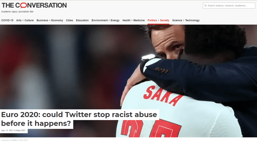 The research was shared on Tuesday 13th July in this article on The Conversation (within 2 days following the incident) and highlights the challenges for International Events in managing the issue of racial abuse. Some Twitter fans using the hashtag #Euro2020final posted racist messages against England’s black players which included Bukayo Saka, Marcus Rashford and Jadon Sancho.